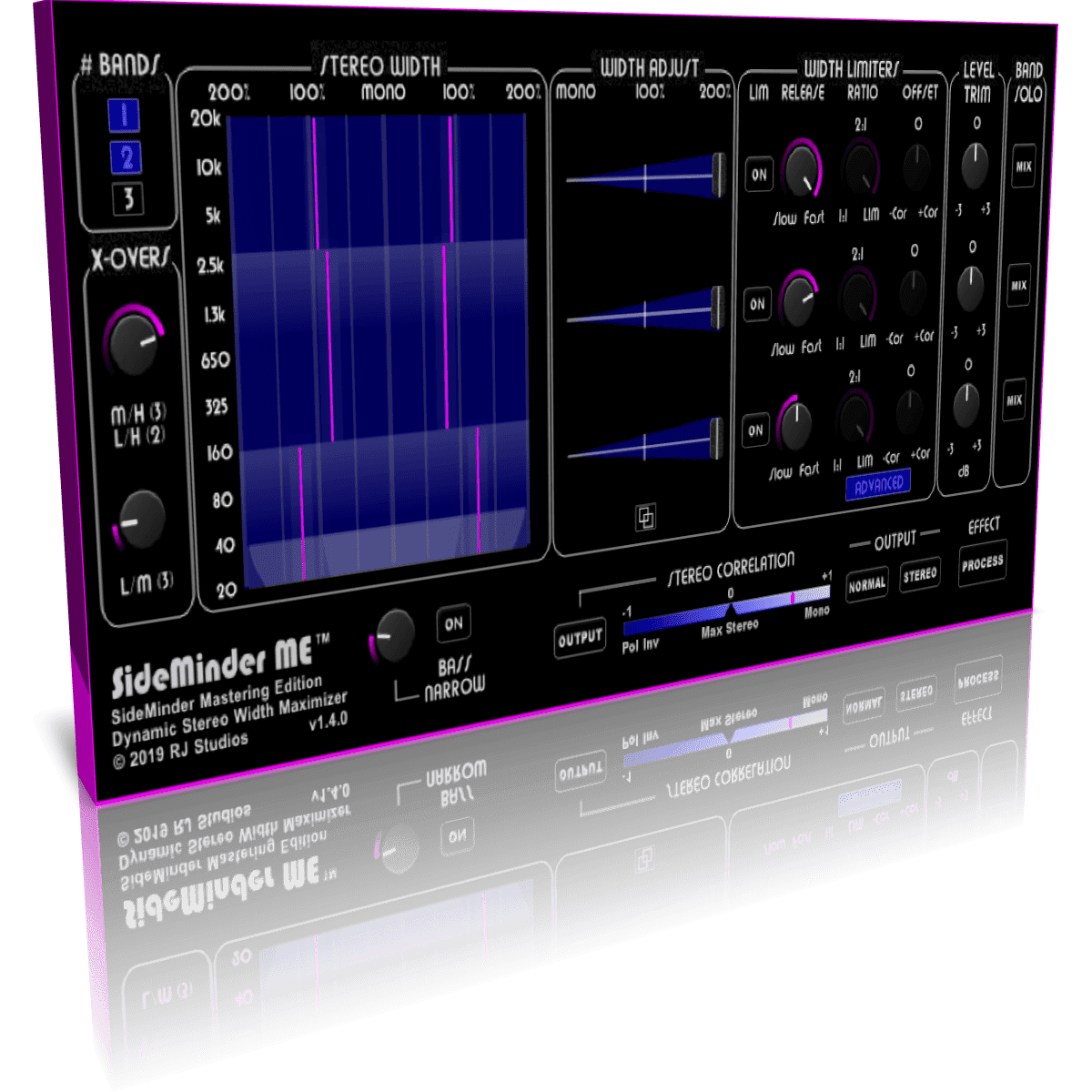 SideMinder ME is an advanced and feature-packed version of the original SideMinder with up to three independent bands of stereo width control plus extended range Bass Narrow control. Additional features include selectable input/output correlation metering, stereo/mono and normal/delta outputs for quickly auditioning SideMinder ME’s action.