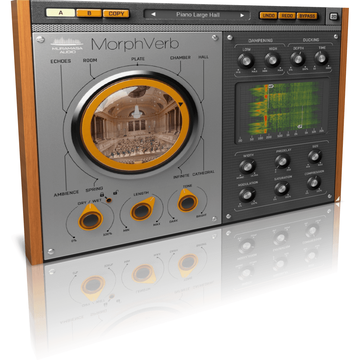 MorphVerb covers all reverb types you could think of. It offers lush algorithms for Spring, Ambience, Echoes, Room, Chamber or Plate. It also features great spaces like Hall or Cathedral and your reverb can even be Infinite.