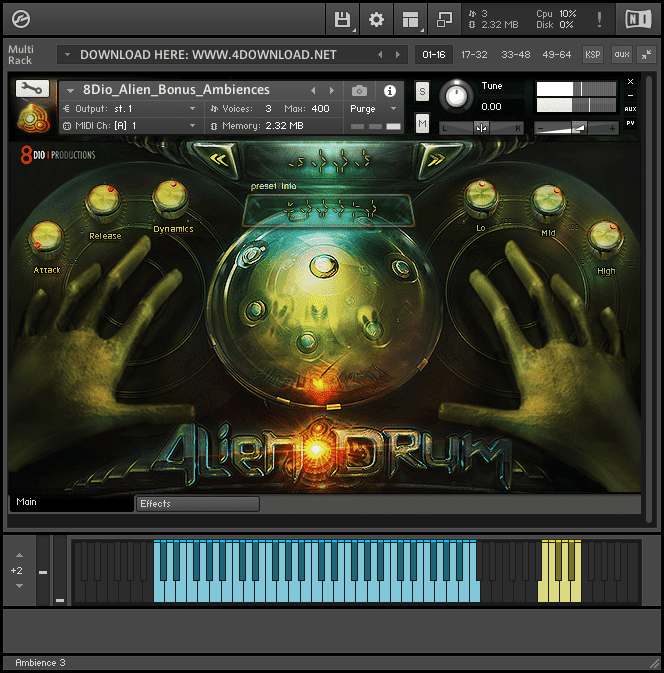 The Alien Drum is incredible easy to use and lends itself very well to alternative instrument design. We created a variety of morphed presets that mixes the Alien Drum with other instruments from the custom 8Dio sample catalogue (ex. modified piano, plucked piano, tonal percussion, custom string instruments, synths etc). We also created a 3D animated interface (be sure to check the video) – and you have front-face controls, including Attack, Release, Dynamics and a nice 3-Band EQ.