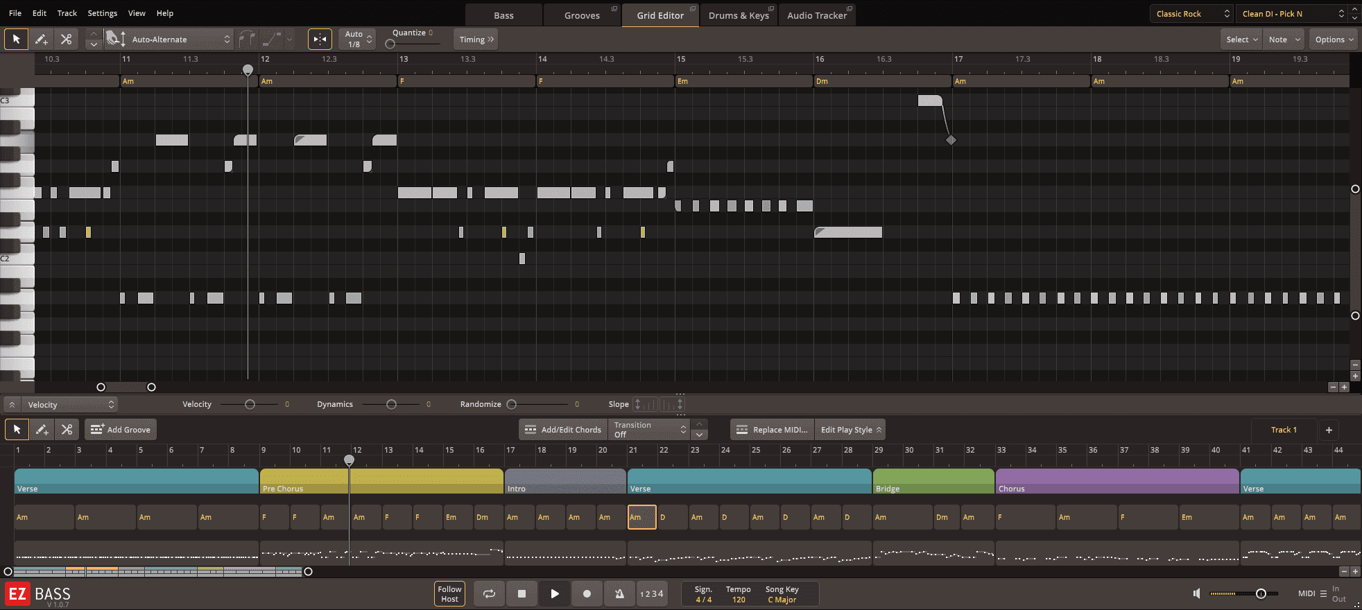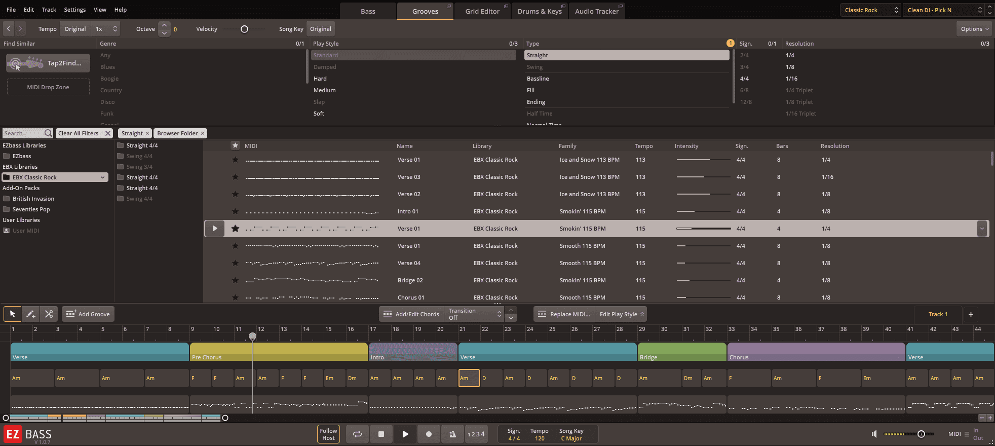 The bass in the Classic Rock EBX was captured with the same scrutiny as the instruments included with the core EZbass library and covers all the subtle articulations you need in order to produce stunningly real performances. In addition to the samples that were recorded using fingers, it also includes two separate striking options for pick – one captured near the bridge and one near the neck. This provides you with three fundamentally different tonal characteristics for the same instrument – from round and mellow to bright and pristinely distinct.