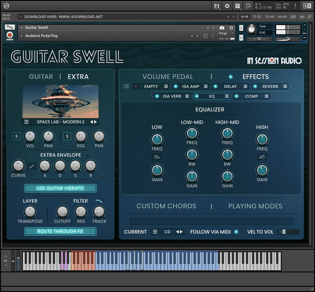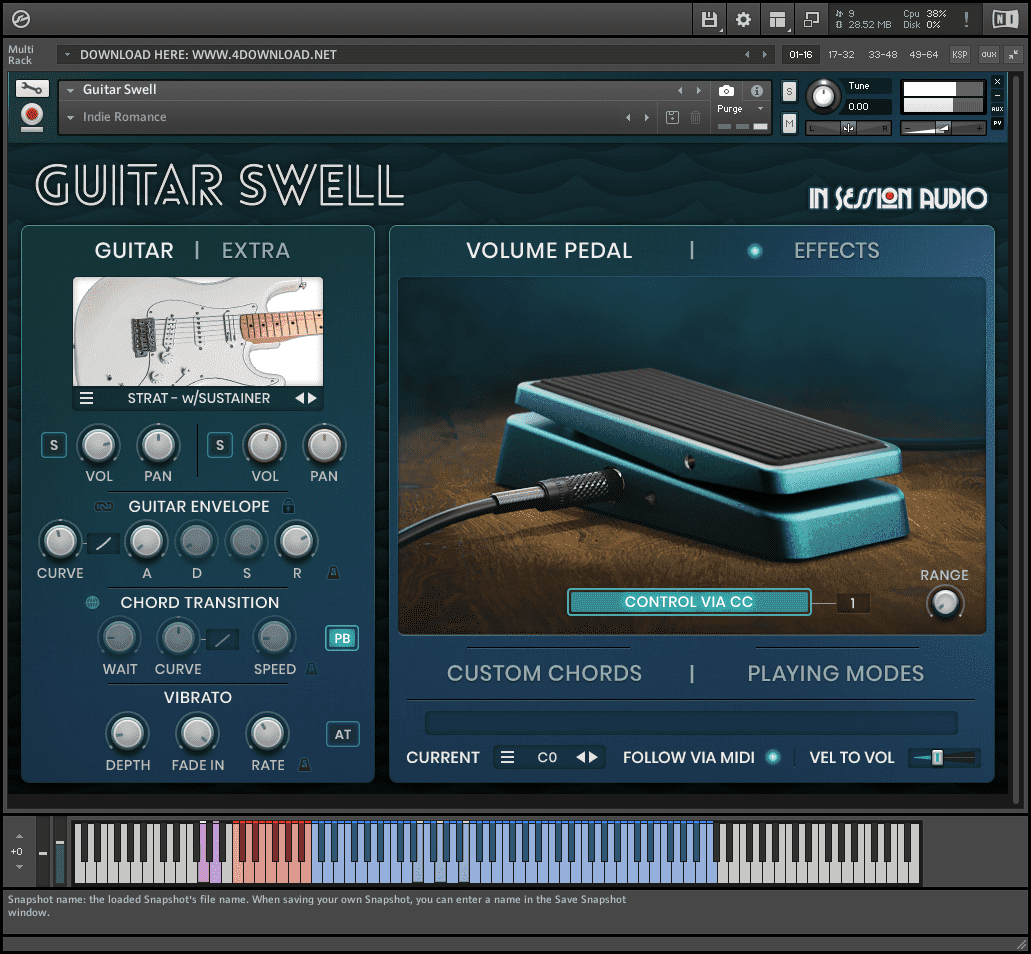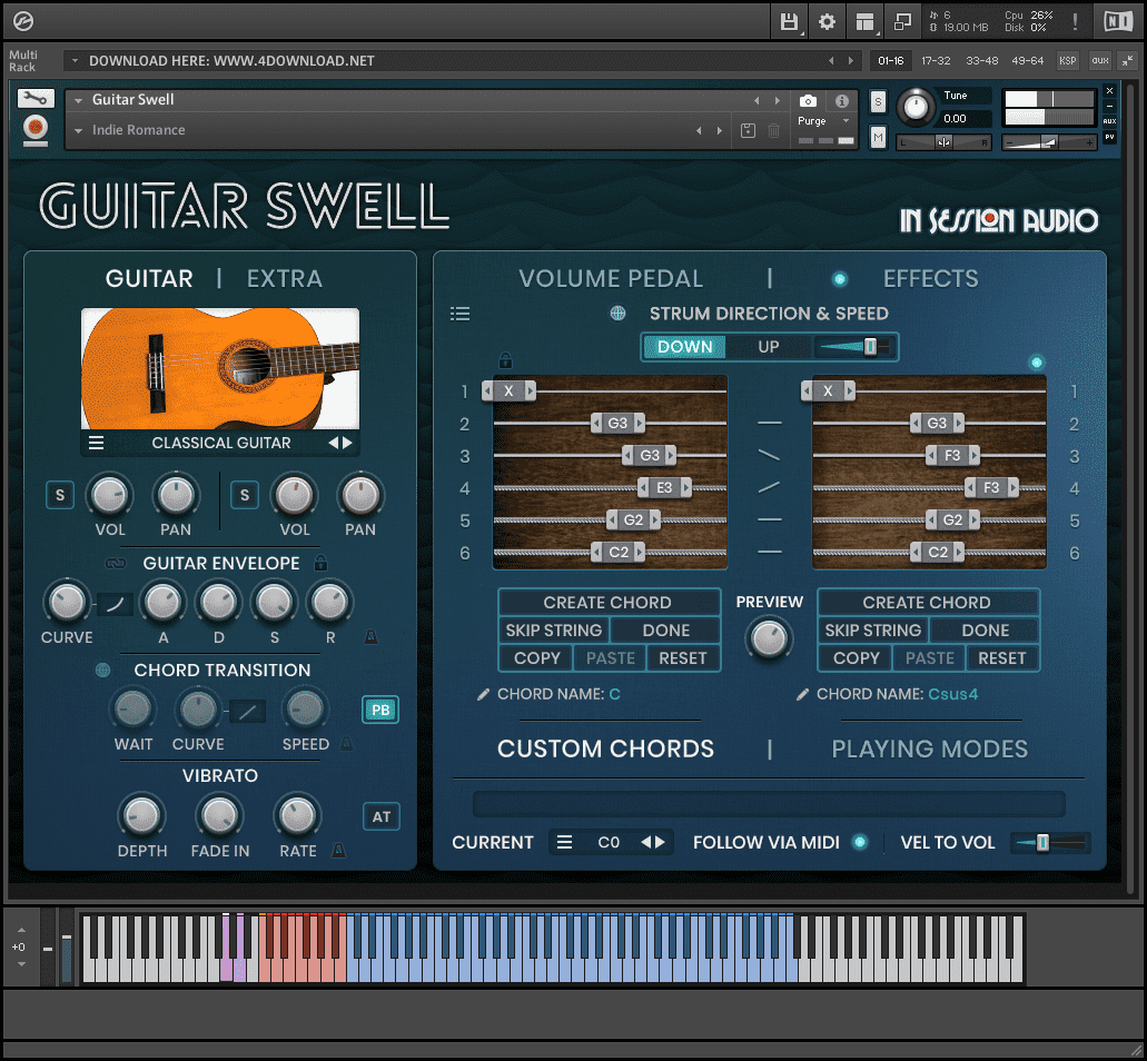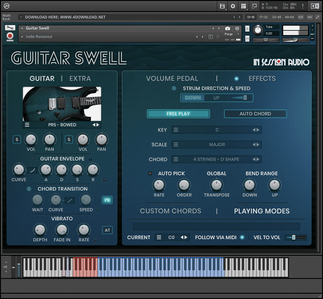 Guitar Swell is a virtual instrument sample library designed to easily create soundtrack-worthy ambient guitar performances with an emotional quality. Freely play melodies, parts and chords. Or, strum custom and auto-generated chords from single keys to build simple-to-play “no wrong note” progressions.