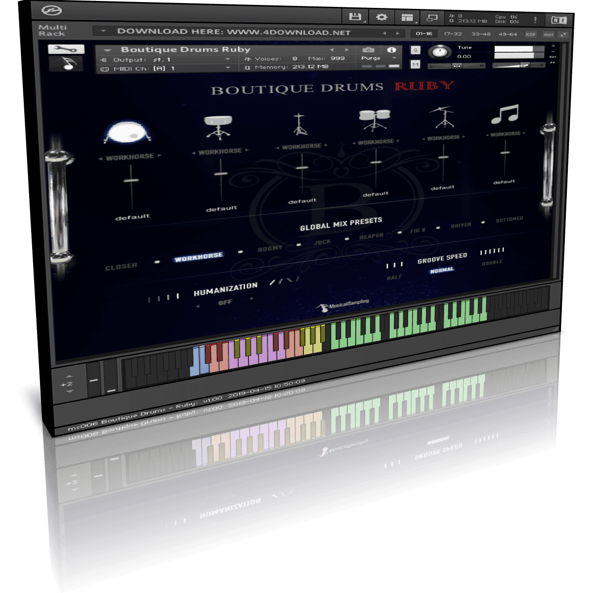 Each of the eight mixes were created from scratch using an arsenal of processing tools, both hardware and software. We chose to develop the presets outside of Kontakt to deliver what we felt were precision mixes with the right amount of punch, balance and vibe while providing just enough headroom to treat well to additional processing. Under the hood, Ruby also alternates between two different sets of hi-hat/ride multisamples; depending on how quickly you hit successive notes for the given articulation. The initial hit triggers the isolated sample while subsequent hits trigger repetition samples.