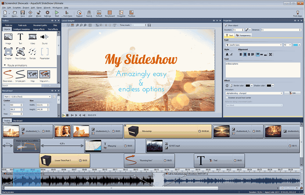 - Object effects that automatically animate or arrange your images, e.g. a transition using a soft "Ken Burns" effect, or a scroll in a filmstrip