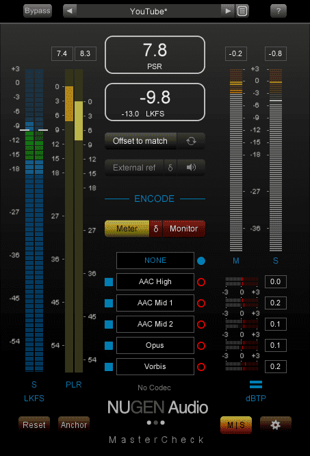 All major online services encode your music, using different specs and formats depending on the playback device, the connection speed, or even whether the user is a “basic” or “premium” customer. Hot mixes can introduce True Peak overs that will clip on playback. MasterCheck detects these errors, and you’ll be able to hear obvious frequency masking and other artefacts. You can monitor the following codecs, with presets for specific streaming services: