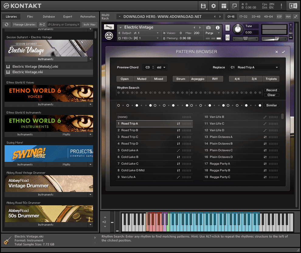 With 231 patterns, ELECTRIC VINTAGE delivers an extensive library across a diverse range of playing styles – combining strummed, open, and muted chords, riffs, arpeggios, harmonics, pinch harmonics, reversed patterns, glissandos, dead notes, and more. Use keyswitches on your controller to create unique rhythms, and build your own combinations from the pattern browser. The integrated Rhythm Finder makes it easy to search for patterns by rhythm and playing style.