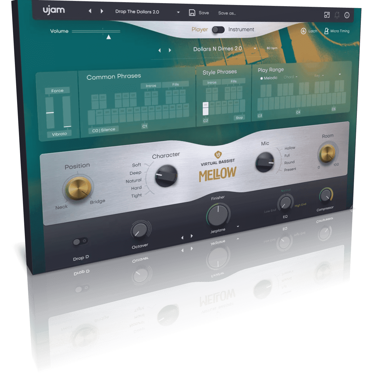 Virtual Bassist MELLOW has two distinct modes – Firstly, Player Mode, that gives you easy access to UJAMs traditional fail-free GUI and control set, just set the musical key and decide on the chords of the song and MELLOW does the hard work, even intelligently choosing the most appropriate articulations to augment your basslines.
