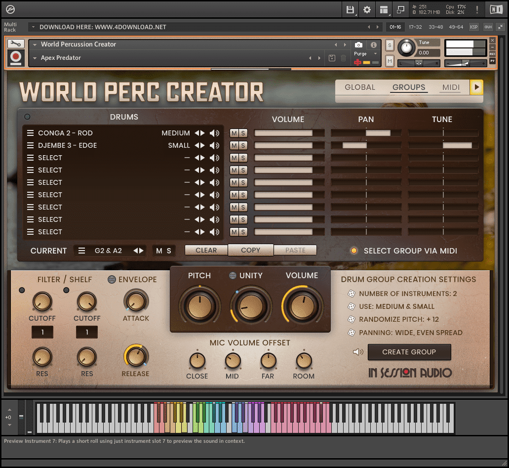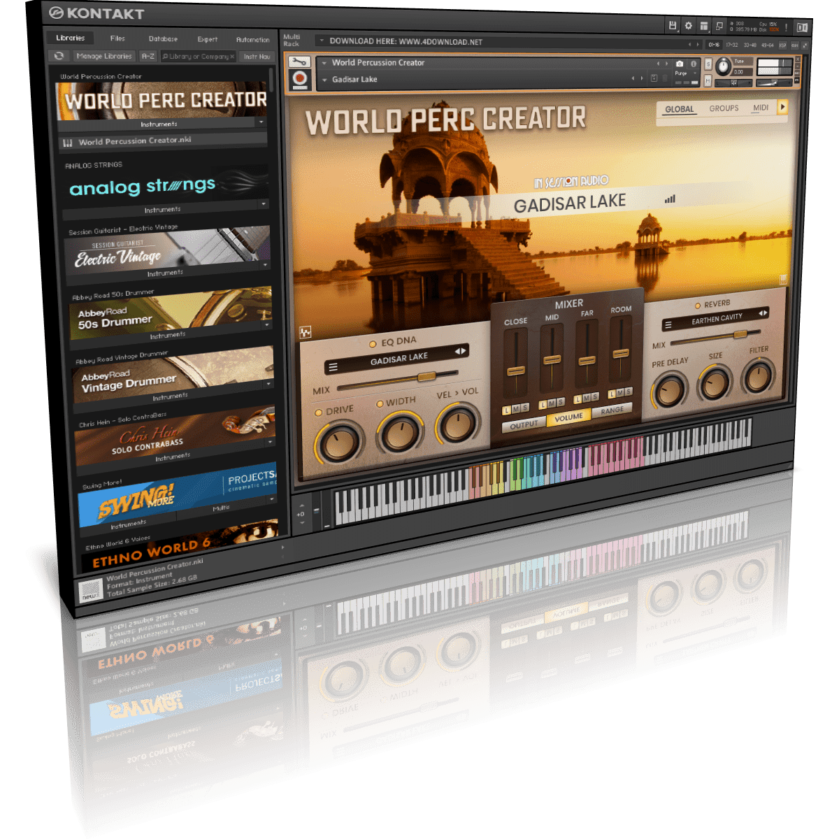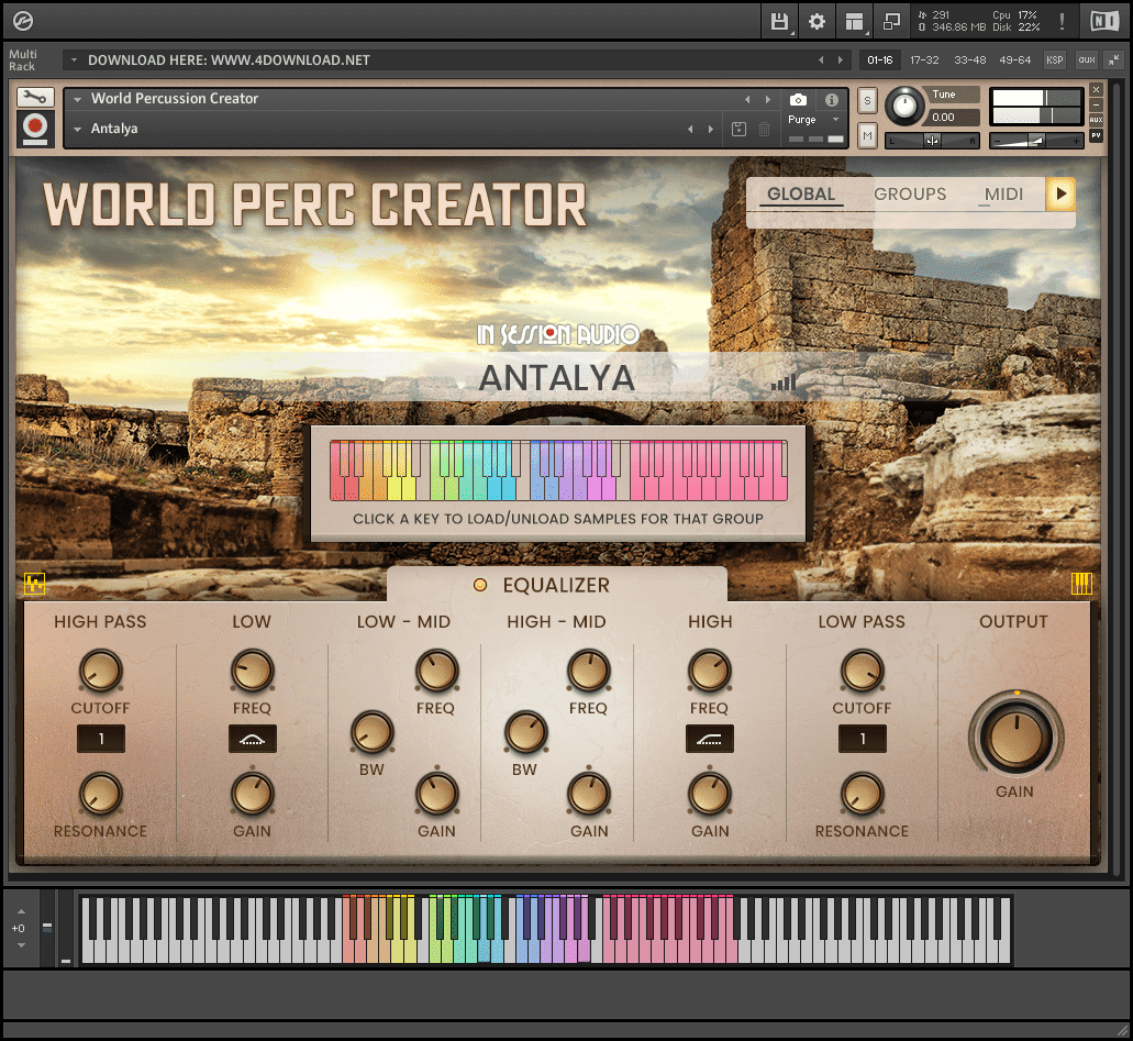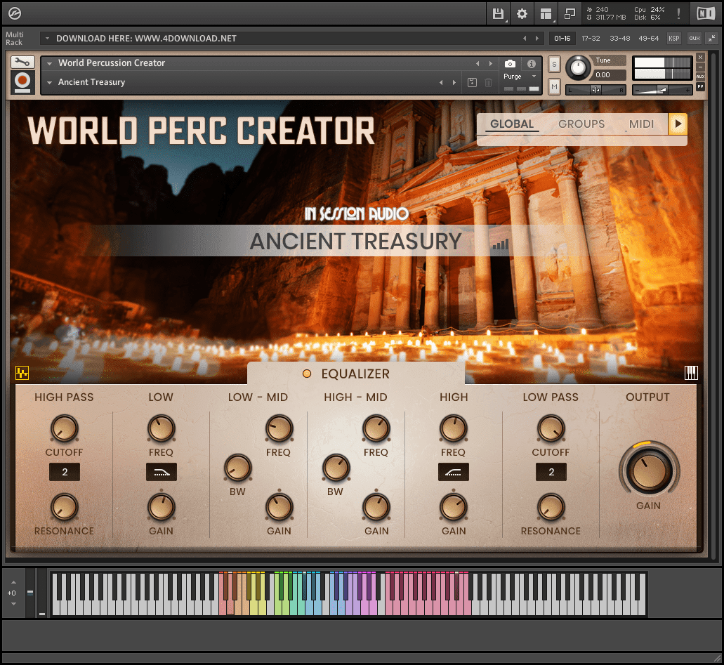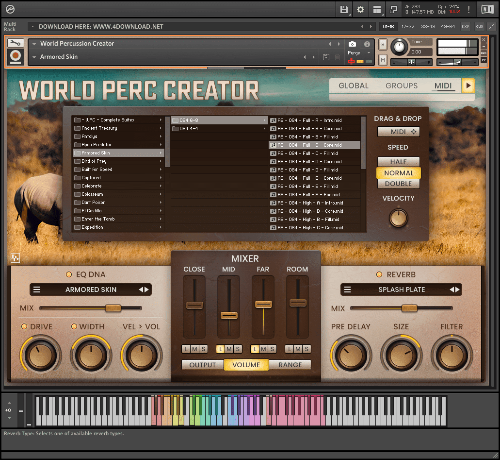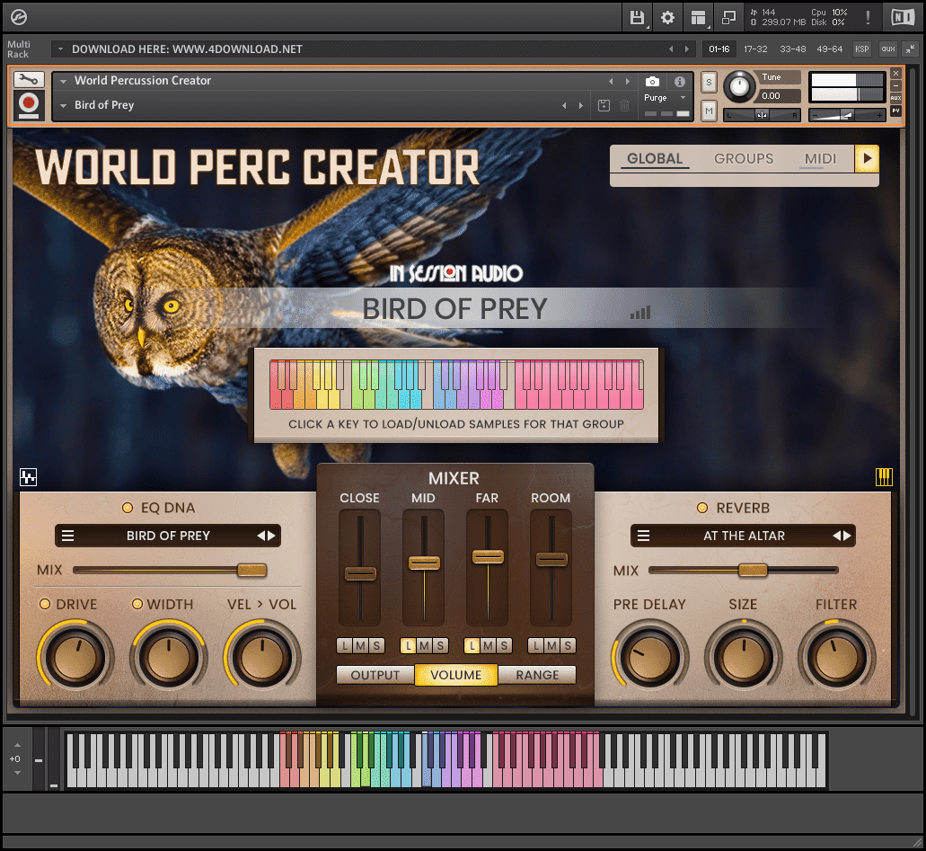 Ethnic, hand played and regional drums are often used to conjure the sound of distant lands, age-old civilizations, exotic wildlife and human adventure. World Percussion Creator is a virtual instrument sample library designed to convey this natural sound in a new, larger and more flexible way. Where most libraries present limited variations, World Percussion Creator allows you to create, control and generate multiple solo and ensemble groups of your own from a selection of 36 drums and 36 small percussion instruments – all playable from a single interface.