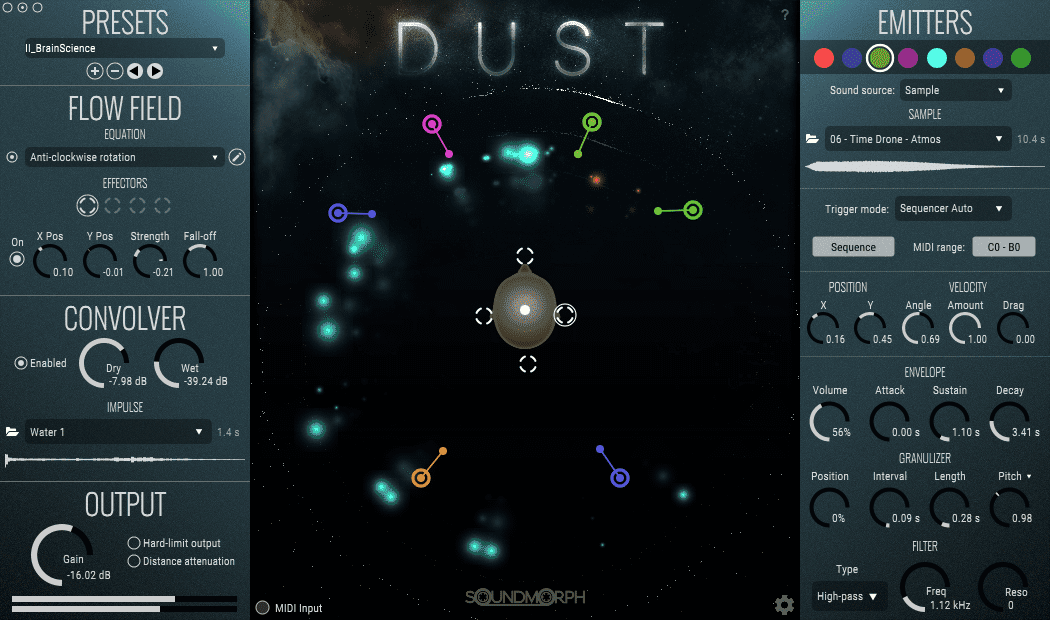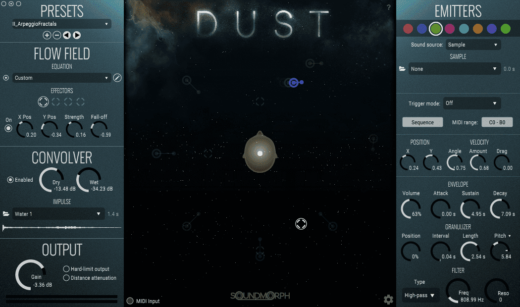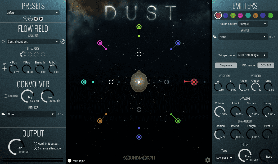 DUST creates a sonic soundscape never thought possible before. When you start creating with it, you'll see just what it means to lose joyful hours exploring it's capabilities. DUST is a synthesizer plugin based on a real-time particle simulation, where each particle is a separate granulating sound source. The motion of each particle is determined by the flow field, which determines the force applied to each particle at each point. Just like how the flow of a river determines the path of a leaf floating down in it. This is our most ambitious software release to date, and you are going to love it! Not only is DUST addictive to play with, but it generates some of the coolest sounds ever created.
