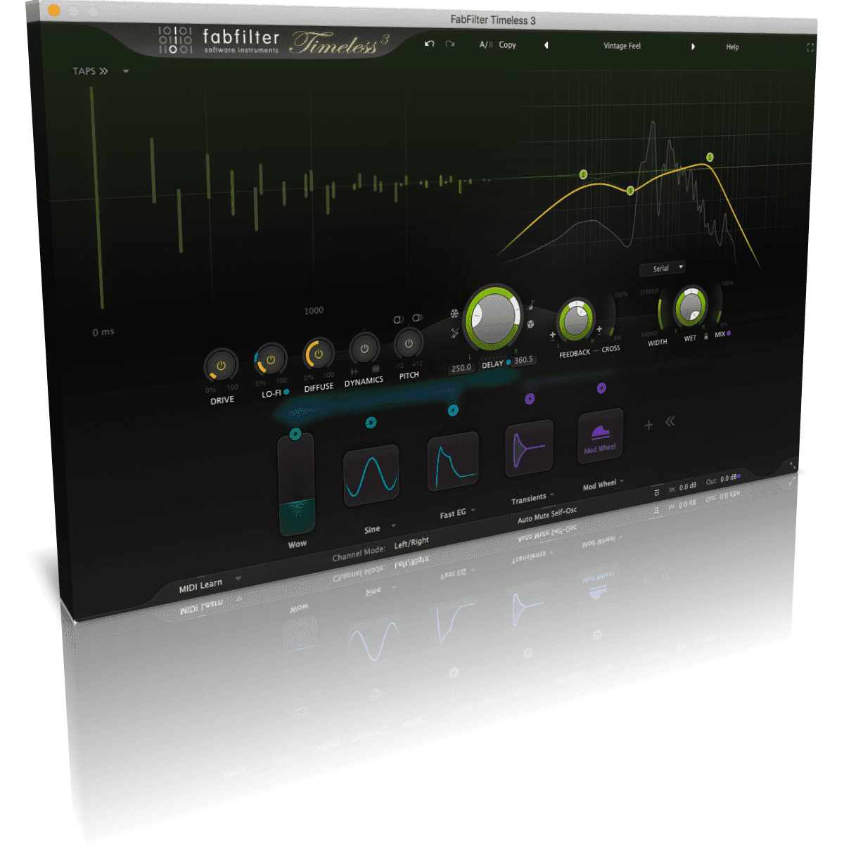 FabFilter Timeless 3 is a versatile, vintage-sounding tape delay, which will fully satisfy your everyday delay needs. And with its unique effects, filters, tap patterns and unlimited modulation options, you can just as easily turn it into the ultimate sound-mangling machine!