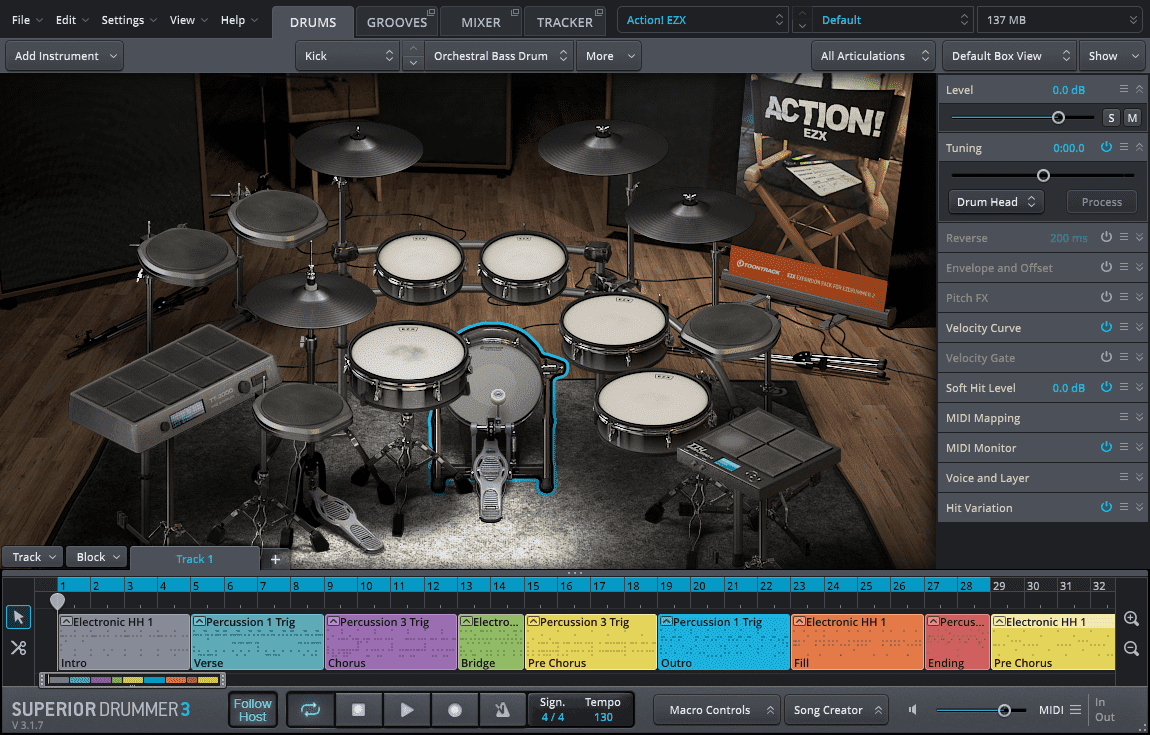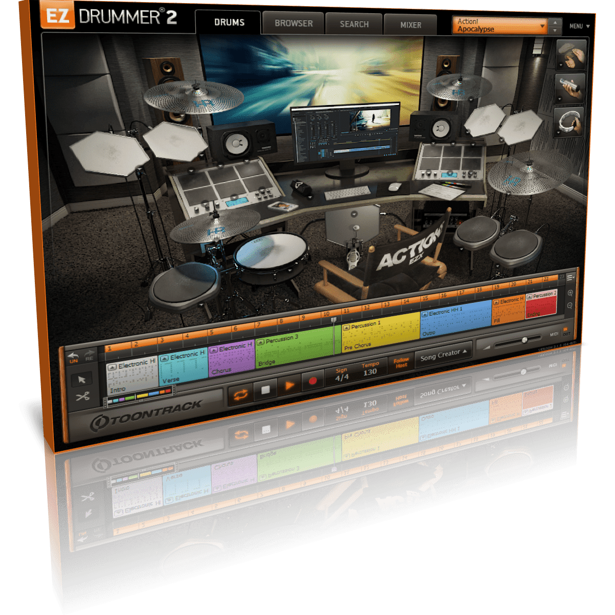 The Action EZX presents a fusion of orchestral percussion, sound effects, custom foley and classic drum machine sounds, designed for use in any creative context where beat, groove and tone are allowed to transcend the traditional confines. In addition to classic orchestral instruments like timpani, tamtam and timbale, it also captures one-of-a-kind foley, risers, claps, snaps, drops and layered textures of sound never before heard – all intuitively blended, mixed, matched and saturated with various effects in creative hybrid kits. All in all, in excess of 450 individual percussive sounds are presented and used in the more than 21 mix-ready kit configurations included.