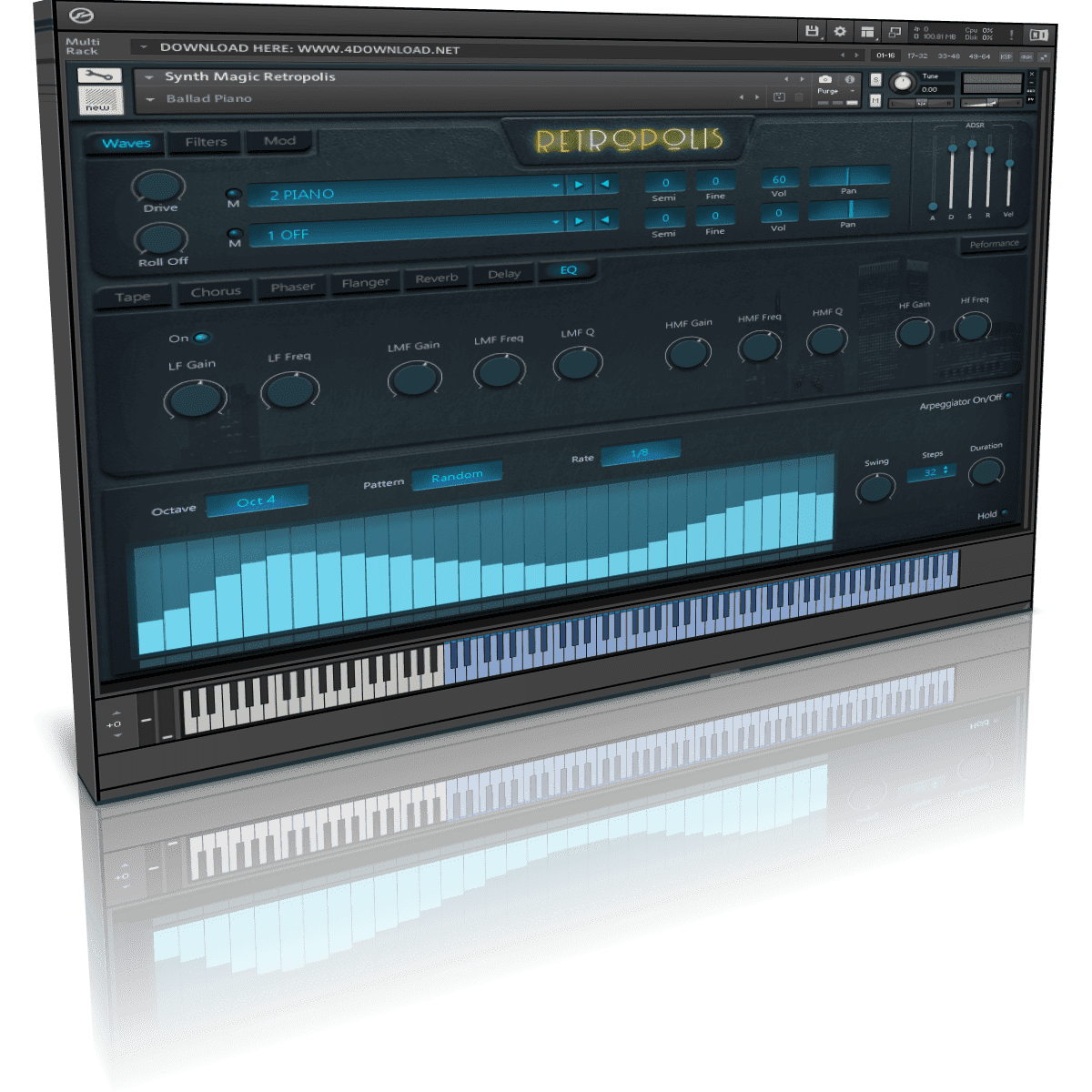 Synth Magic is a collection of Synthesizers were used in the creation of Retropolis such as: Red Sound Dark Star, Alpha Juno2, Kawai SX240, Arp Odyssey, Moog MG-1. All samples are placed under the control of a very easy to use interface and are accessed via a menu system. Retropolis has a full effects section and also comes with an Arpeggiator which can also be used to modulate filter cutoff. Retropolis comes supplied with over 200 snapshots. All snapshots are placed into folders such as: Bass, Strings/pads, synths etc for easy selection of snaphot presets. Synth Magic Retropolis is a Kontakt instrument (Full version of Kontakt is required 5.8.1 and higher).