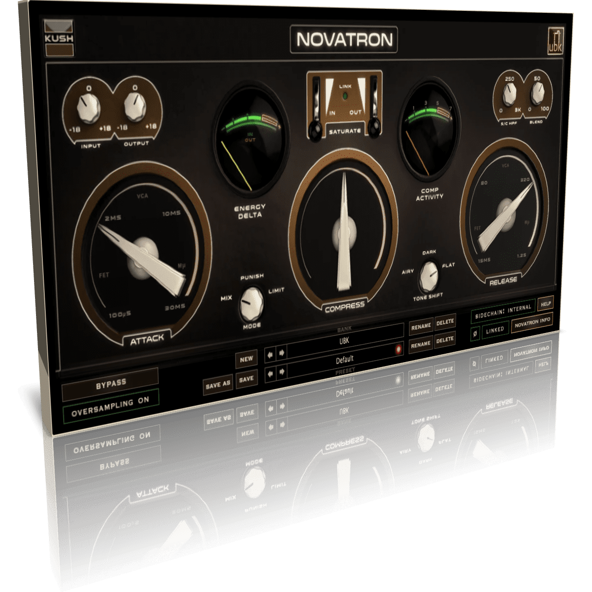 DSP compressor with groundbreaking attack & release qualities, separate i/o Saturation, and two optional tone circuits. Novatron is an analog-modeled compressor that borrows so many sonic properties from so many different classing hardware units that, ironically, it could only exist in the world of DSP. With separate in/out Transformer Saturation, two optional Tone Circuits, and a monstrous compressor with groundbreaking attack and release characteristics, the Novatron produces the same three-dimensional 'solidity' and tone typically reserved for expensive hardware.