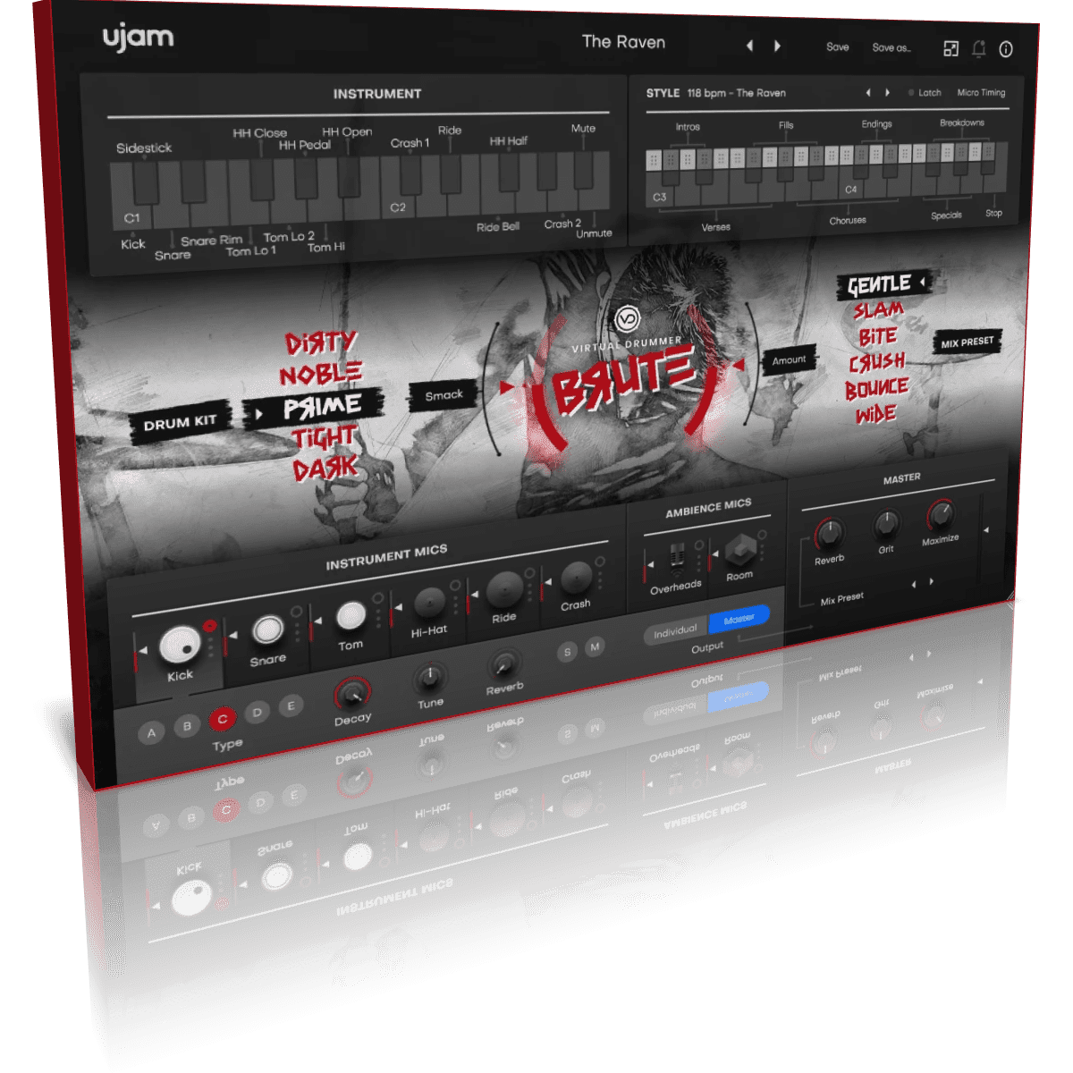 BRUTE features 5 Drum Kits, 6 mix presets, 31 Styles with 23 ready-made phrases each, for a total of 713 phrases.