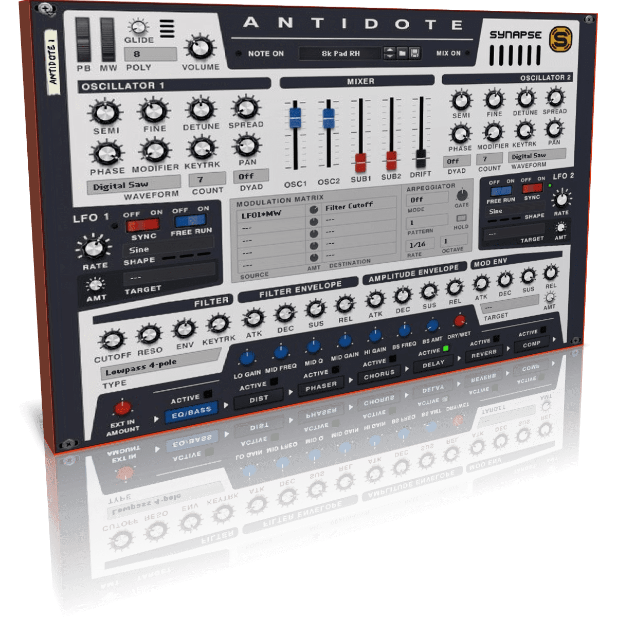 One of the big strengths of Antidote is its massive effect chain, which contain some of the best effect algorithms from Synapse Audio. A total of 8 effect modules is available, all of which can be used simultaneously.