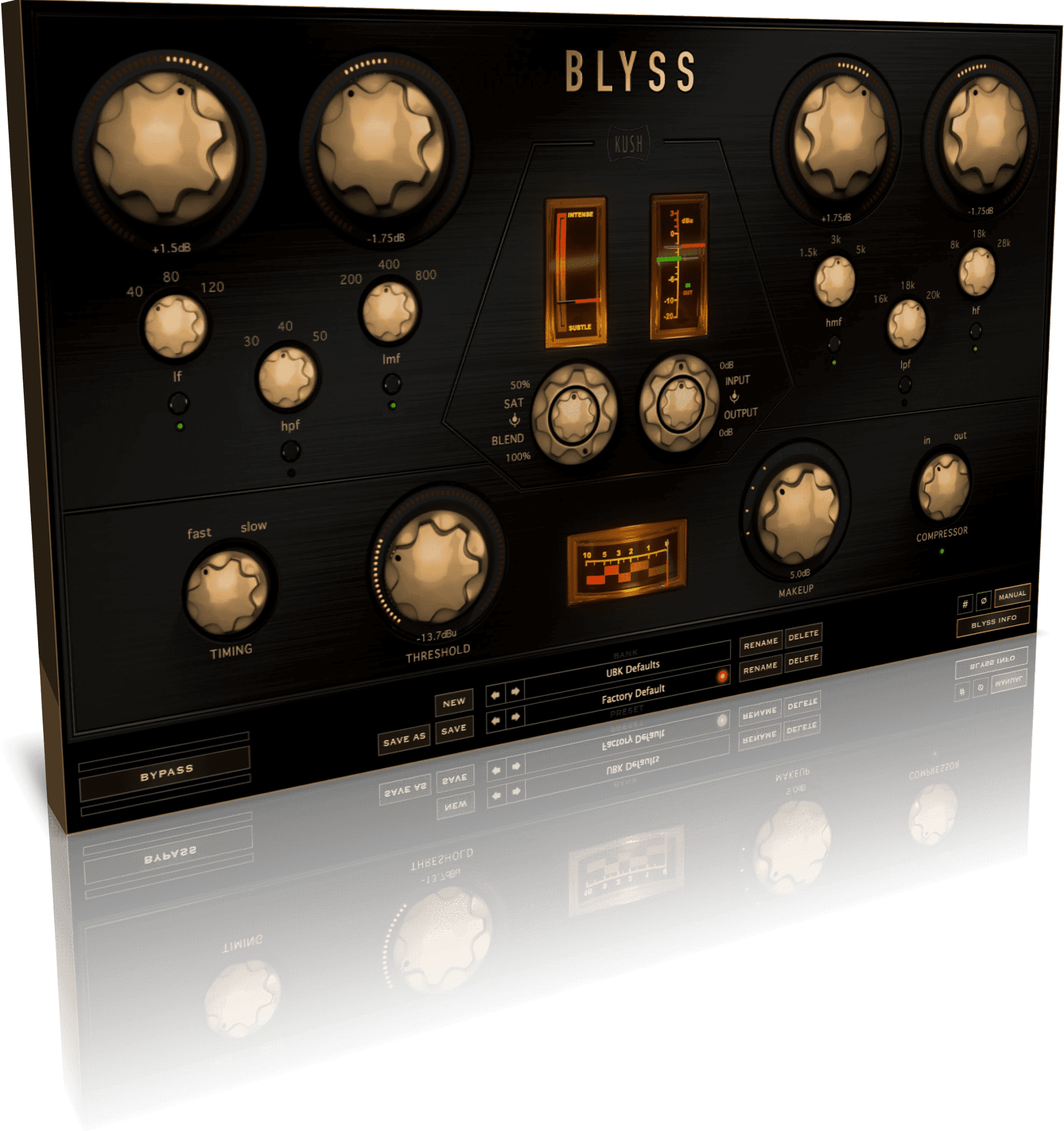 When first launching Blyss, it’s tempting to grab the big EQ knobs and go to town, but be aware: the heart of this machine is really the unassuming Saturation section, which integrates painstakingly modeled Input, Interstage, and Output transformers plus 3 discrete op-amp stages into one knob with one meter. You can do a lot for your sounds with the Saturation alone!