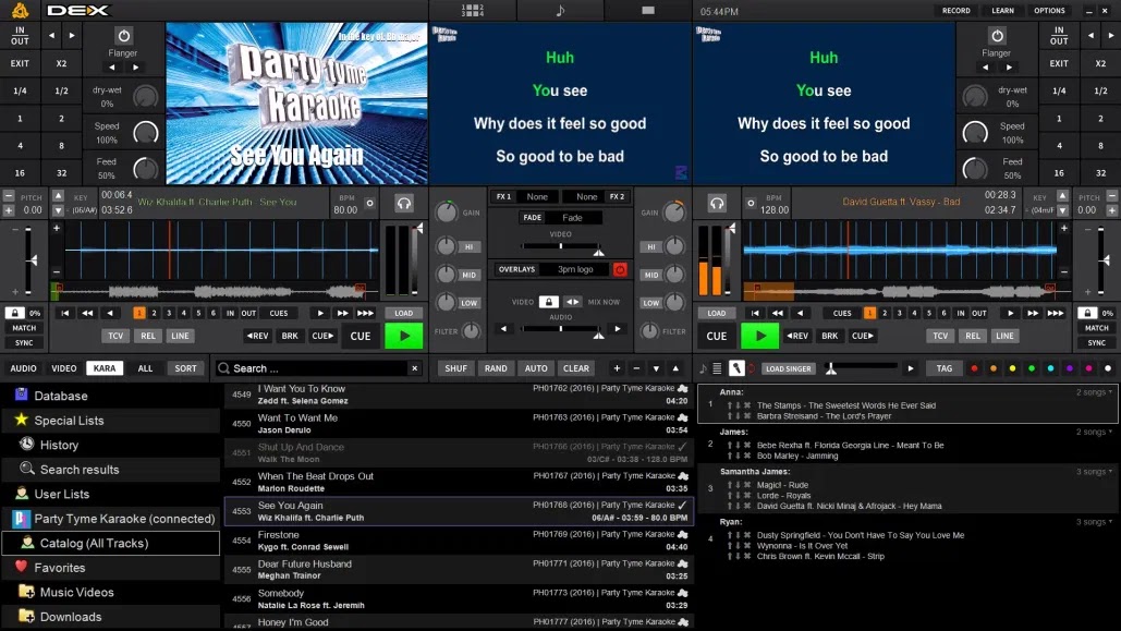 - Up to 4 DJ decks (two for video and karaoke) with professional grade mixer and playlists