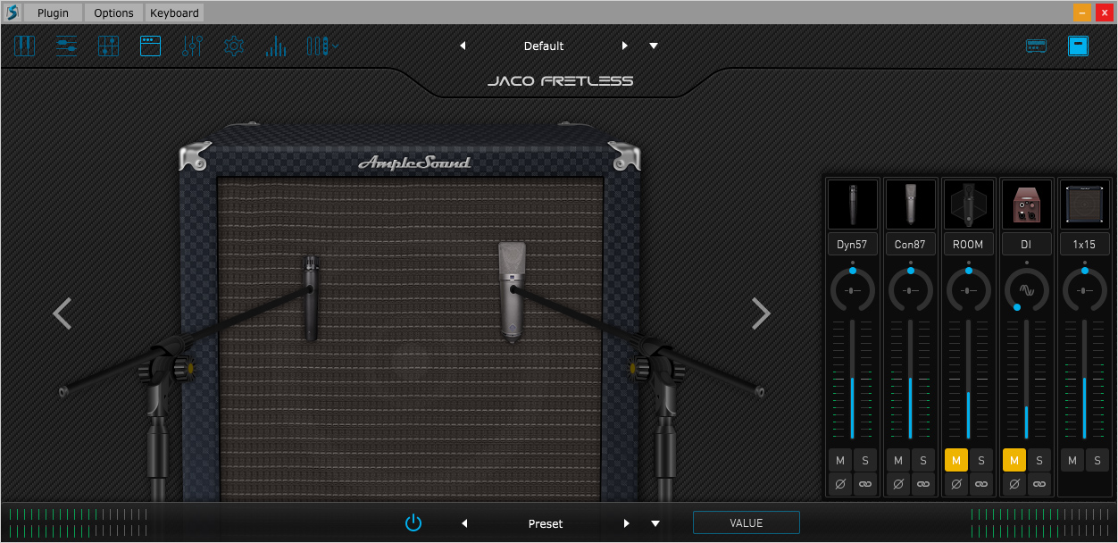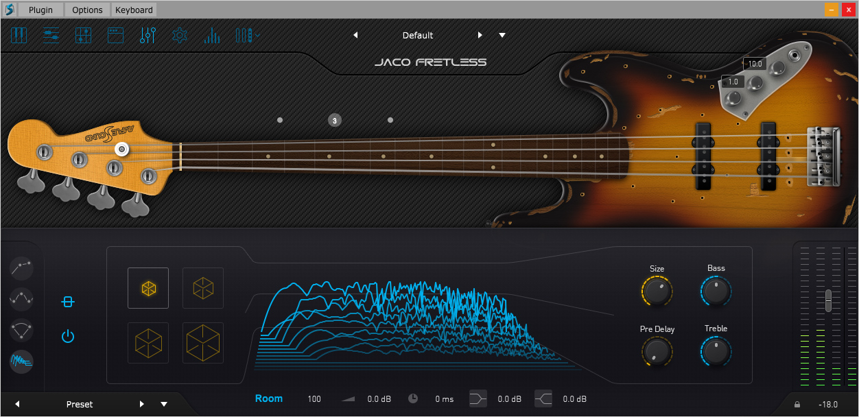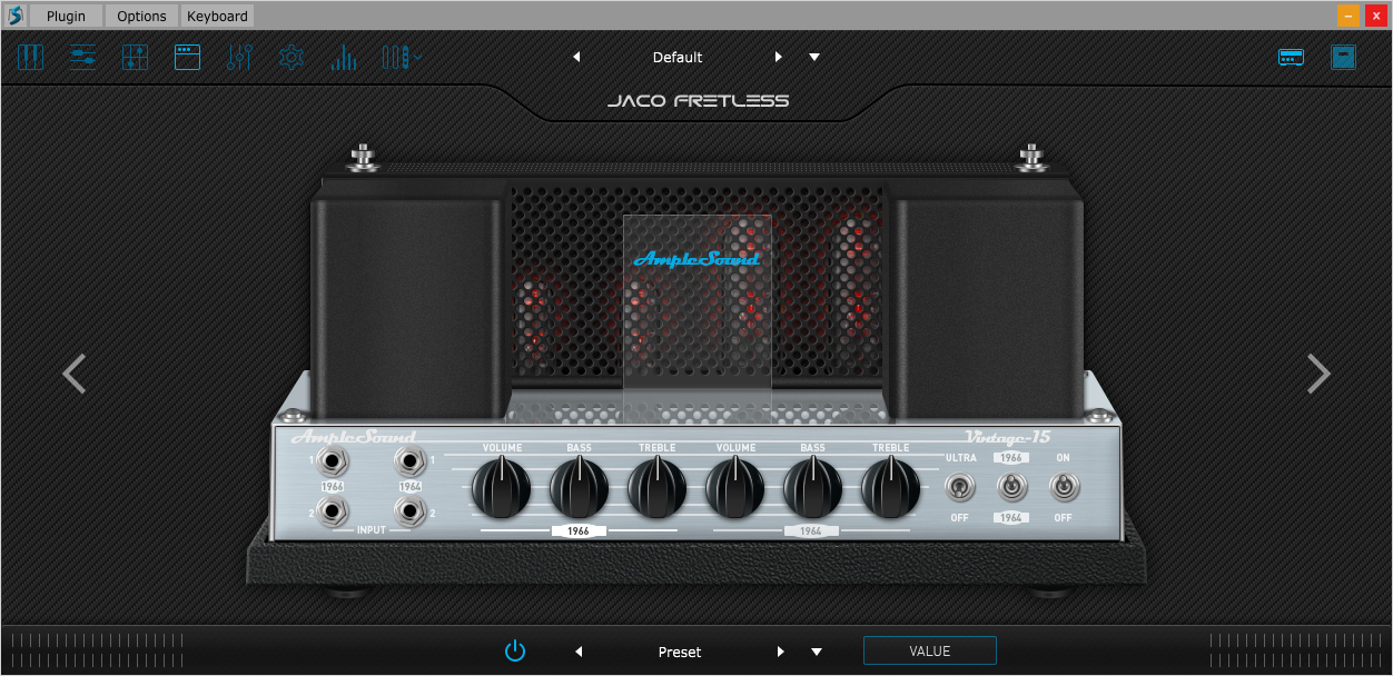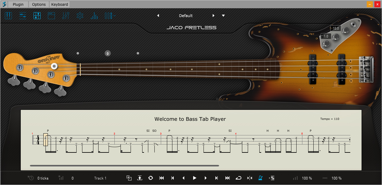 The Jaco Pastorius Fretless Bass from Ample sound is deep-sampled Fender Custom Shop Jaco Pastorius Relic Fretless Jazz Bass. It weighs in at 2.2 GB. It features multiple keyswitchable articulations including sustain, palm muting, artificial as well as natural harmonics, slaps, pops, slides, as well as a repeating note mode. The instrument features intelligent legato scripting which causes it to actually play in position and intelligently select the string that the note is to be played on. The instrument features amp simulations as well as build in EQ, delay, reverb, and compression. The bass also features a large collection of preset grooves as well as a fairly comprehensive sequencer which can be used to edit the performance within the instrument. It is also capable of displaying and playing tablature from a variety of common tab formats.