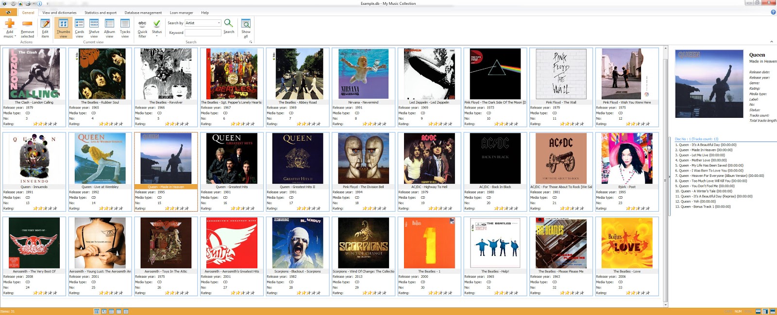 Familiar and intuitive interface allows you to easily and quickly search and browse your music collection. You can sort albums by artist, release year or even by media type. Checking statistics is also easy - My Music Collection allows you to view statistics in a table view or use a variety of diagrams. With music database software you can export your list into almost all popular file formats, including HTML, Excel, PDF, Text file or XML.