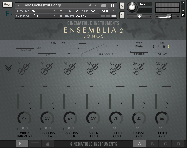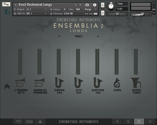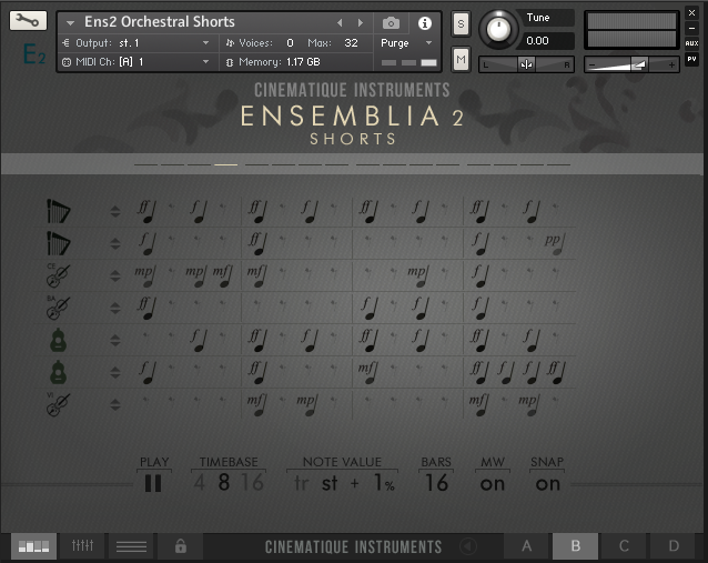 The Instrument amount has increased a lot. Beside upgrading the string section with triples, Ensemblia 2 Orchestral is packed with many new instruments such as saxophones, bass clarinet, trombones, electric guitar and flutes - but also many instruments of our current shop are included. All in all Ensemblia 2 Orchestral now provides more than 80 instruments! (see below). The instruments are well organized available by categories and groups which are displayed dynamically. All the instruments are right at the finger-tips. The Preset Browser comes with over 170 pre-assembled patterns which are easily selectable via a file browser. 4 Units in 1 - Ensemblia 2 Orchestral comes with four separate units in one GUI. This lets you easily switch between four individual units with different patterns on the fly.