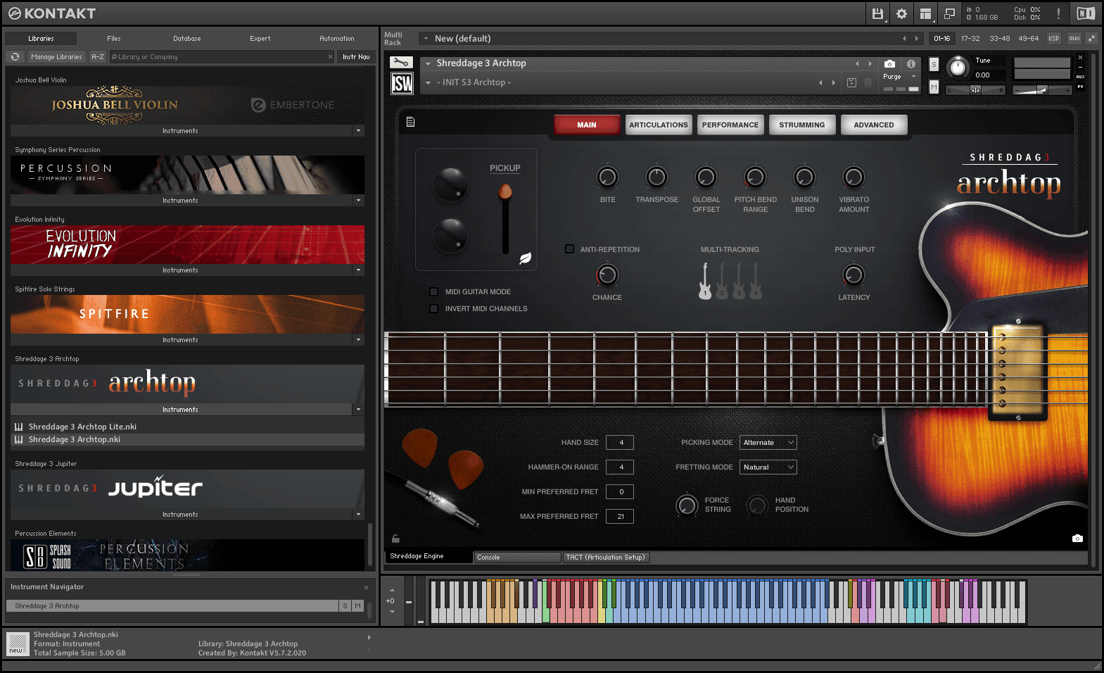 Shreddage 3 Archtop,/strong. was performed by master session musician Josh Workman, who brought detail and nuance to every note. Each sample was cleanly recorded DI through a true analog signal chain for maximum warmth, making this guitar equally usable in both amped and clean contexts. While it is more than capable of hi-gain styles, Shreddage 3 Archtop truly excels with cleaner tones and genres like jazz, fusion, pop, alt rock, blues, funk, and R&B.