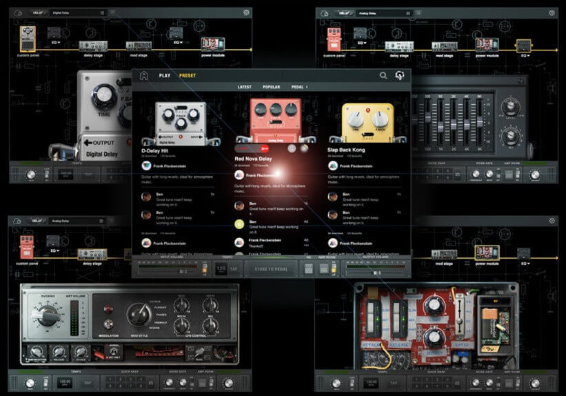- 17 component-level emulation of distortion, overdrive, fuzz and booster pedals included with the introductory release.