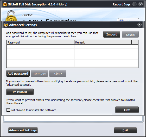 If you let computers remember your encrypted USB Disks, you can add password to cache then you can use it without entering password each times. In advanced settings you can set to prevent others from uninstalling this software.
