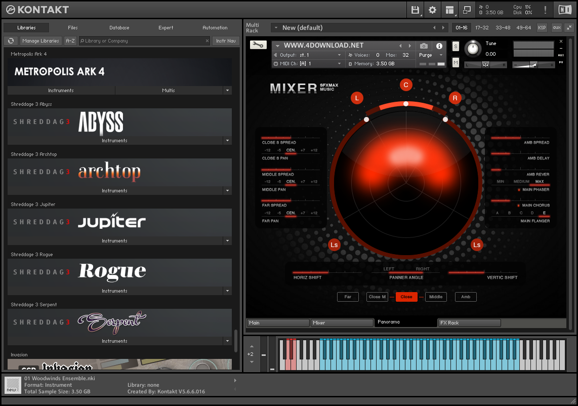 Sonex Audio has released Wodwinds Ensemble. Main Page offers global controls over volume, pan, a/d/s/r, reverb, delay, distortion and more. Mixer Page includes controls for all 4 mic positions: close, mid, far and room (ambience), as well as a full mix (out) option. Panorama Page includes controls over Stereo Width (mics and mix), Phaser, Chorus, Flanger. Effects Page includes controls over EQ, Flanger, Compressor, Delay, and Reverb.