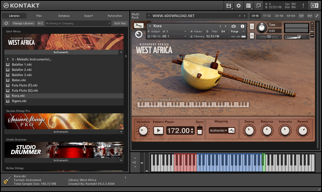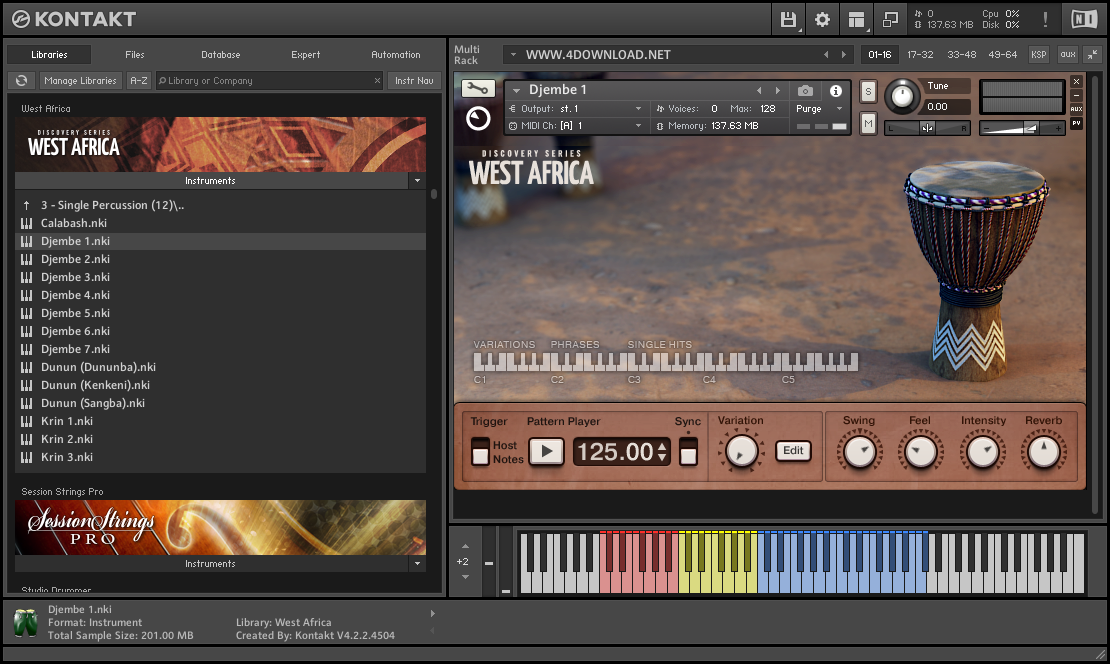 The latest release in Native Instruments DISCOVERY SERIES focuses on the rich and profoundly influential traditions of West Africa. This KOMPLETE Instrument features a collection of beautifully sampled percussion and melodic instruments, playable individually or as customizable ensembles with highly inspirational pre-programmed patterns. The rhythms of all percussion instruments are also easily editable via the built-in sequencer for instant polyrhythmic groove creation. This instrument is truly a magnificent addition for producers of contemporary and traditional music.