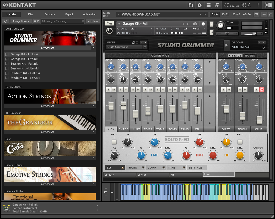 Behind the glass, STUDIO DRUMMER provides a dedicated mixing environment. All drums close mic’d, plus adjustable snare bleed, stereo overheads, room mics for ambience and an additional mono mic on the entire kit. Mixer presets, with precision mic levels, room sound and effects, provide fast-track settings for a wide range of sounds.