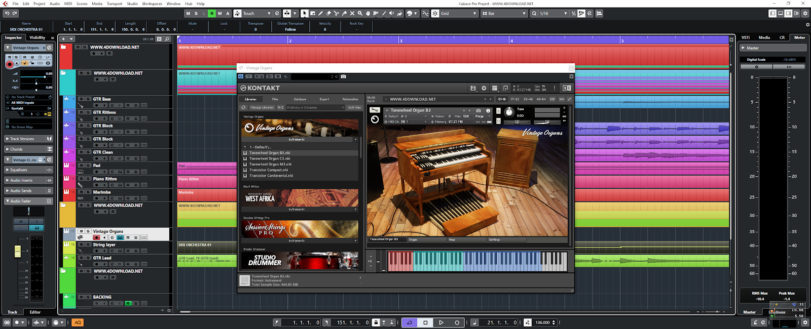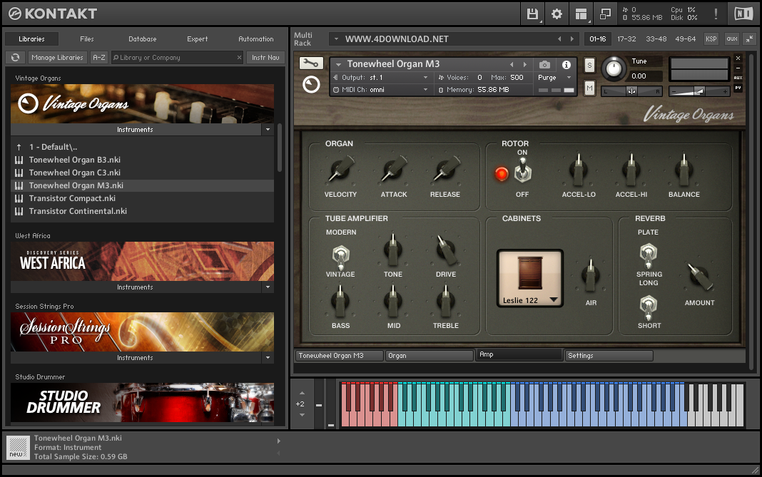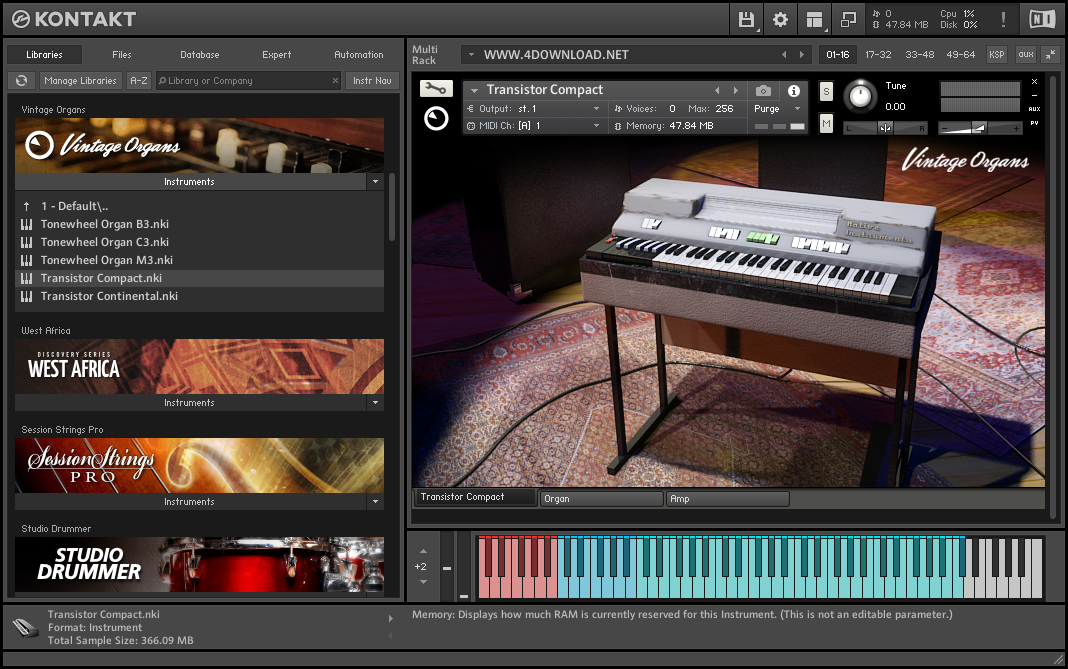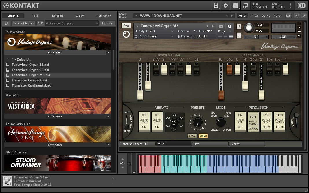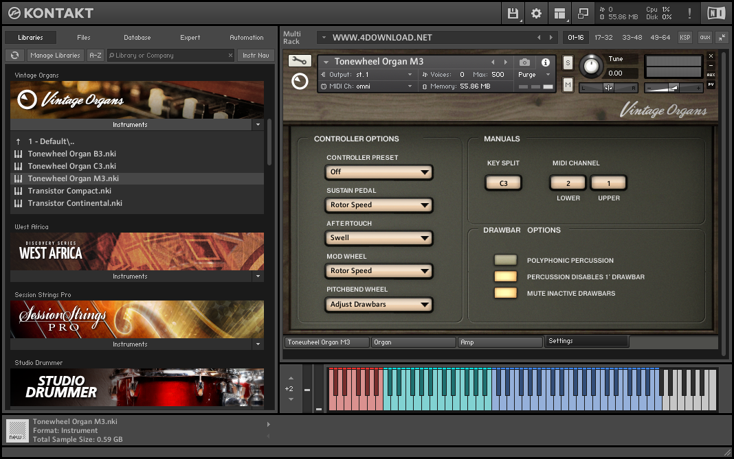 Part of the KOMPLETE instruments and effects family, VINTAGE ORGANS includes the sounds of the Hammond® B-3, C-3 and M-3 models, the Vox Continental™ II and the Farfisa® Compact, recorded in highest quality from the original instruments exclusively by Native Instruments. The Organ and Amp pages provide full control over sound through drawbars, percussion, chorus/vibrato, overdrive, rotary effect, envelopes, EQ and reverb.
