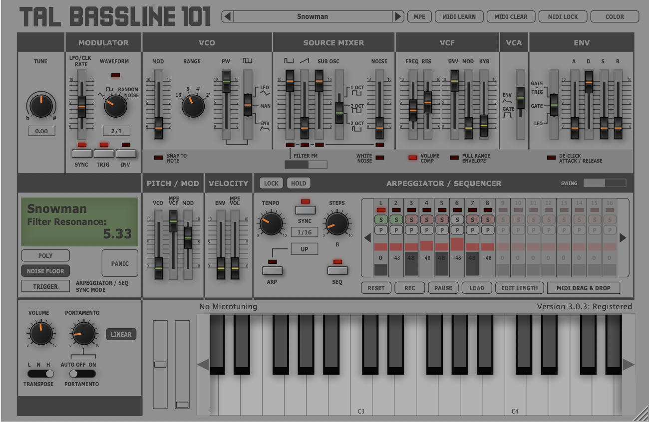 TAL-BassLine-101 is a monophonic bass synthesizer and a very accurate emulation of the popular SH 101. The GUI is intuitive and easy to use. It produces the raw sound you know from analogue devices without any effects. Its 24dB zero feedback delay low pass filter has a very smooth and authentic sound without any digital artifacts, especially designed and calibrated for extreme settings. It sounds even smooth with a lot resonance and a high oscillator pitch where most emulations fail.