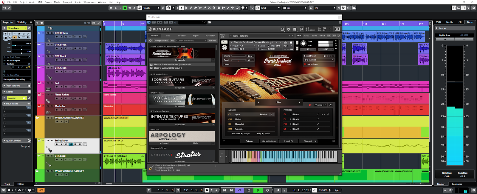 ELECTRIC SUNBURST DELUXE gives you two KONTAKT instruments for creating complete, authentic electric guitar parts. The pattern-based instrument lets you instantly generate riffs, strumming patterns, and arpeggios simply by playing a chord on your MIDI controller. The included melody instrument enables you to combine your own, freely playable melodies with the integrated patterns. Smooth transitions between melodies and patterns help you deliver unique, engaging electric guitar parts for any production.