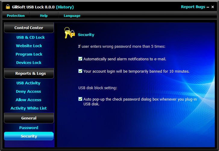 GiliSoft USB Lock is a data leak prevention tool that prevents leakage and copy of your data to USB Drives (Android phone/iPhone), External Drives, CDs/DVDs or other such portable devices. Once installed, USB Lock lets you block all such drives and devices that do not belong to you. USB Lock can stop stealing or hacking and you can share your PC with anyone without fear of data theft. This is an easy USB Secure Software and powerful Endpoint DLP Suite that helps you to lock usb port,make dvd/cd burner read-only, block some websites, forbid some programs and disable more devices. For the convenience of enterprise users to deploy, or secondary development, we also provide the command-line version, please contact us if you need.