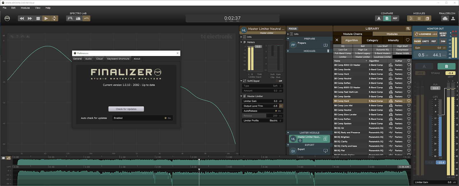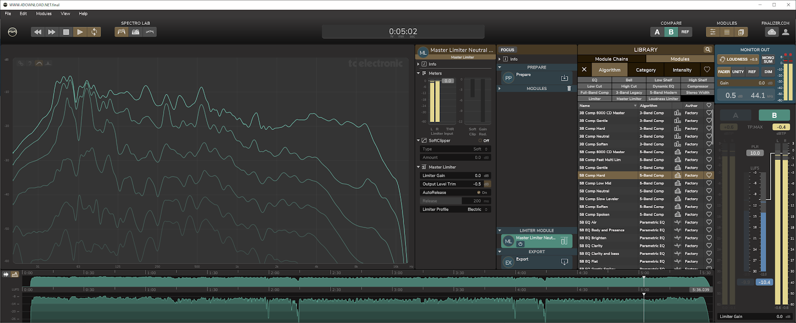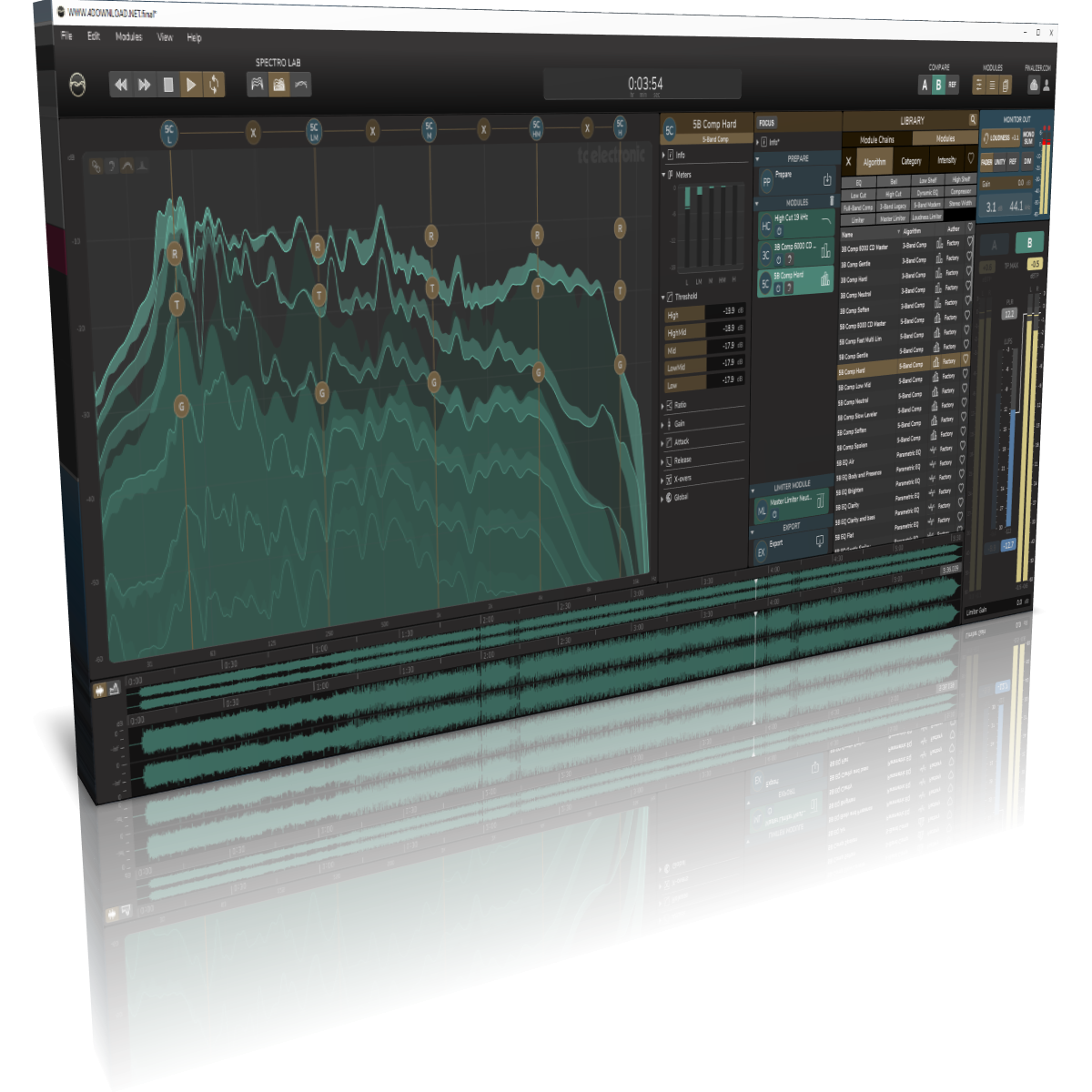 The innovative SPECTRO LAB overview features three different readouts that provide detailed and useful information about your track, and assist you in making fast and accurate mastering decisions. The never seen before Spectral Dynamic Contour (patent pending) shows you the dynamic and spectral characteristics of the entire track at a glance. The high-precision Real Time Spectrum provides spectral details for a quick visualization of the real-time peak analysis and a moving average real-time RMS analysis. The Average Spectral Curve is extremely useful for comparing your music to reference tracks by showing you the average energy for each frequency band over the duration of the song.