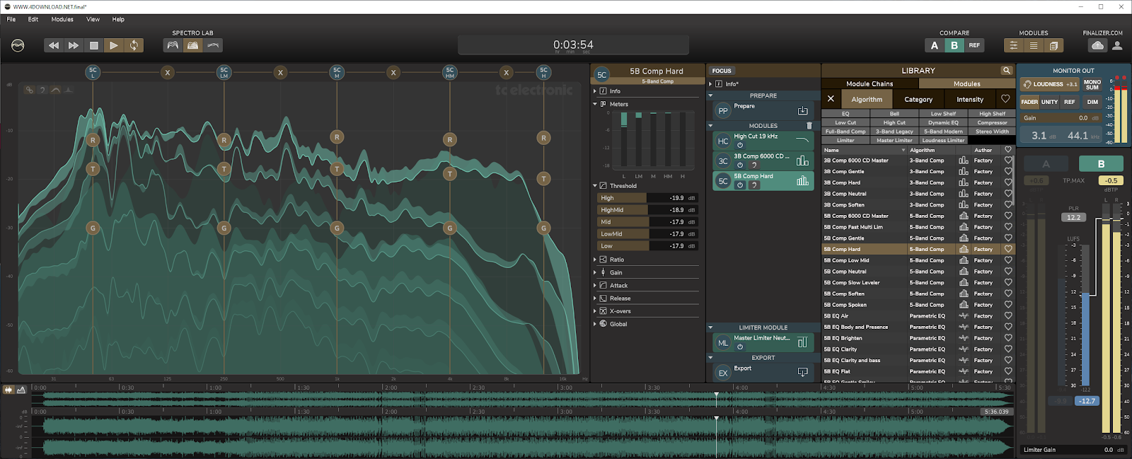 With a wealth of powerful equaliser algorithms, Finalizer allows you to fine-tune your project in detail. Take your pick from a broad range of parametric EQs, low/hi cut filters, low/hi shelving EQs and Dynamic EQs that let you tailor your tracks to taste - with broad strokes or with surgical precision, as you see fit. With Finalizer you can easily obtain the perfect stereo image by tweaking and designing the spatial properties of your track. TC Electronic’s famed full-band and multiband compressors let you balance your tracks and pull specific elements to the fore with extreme precision, thanks to the combination of refined versions of our award-winning System 6000 algorithms and groundbreaking new ones.